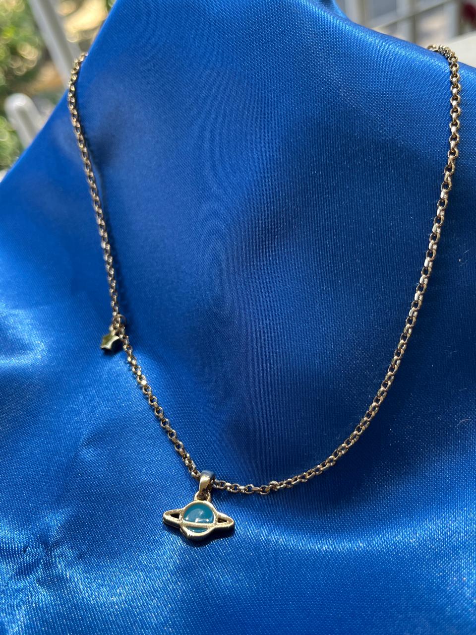 COLLAR CON DIJE DE SATURNO DE COLOR AZUL CON 4 BAÑOS DE ORO DE 18 KILATES