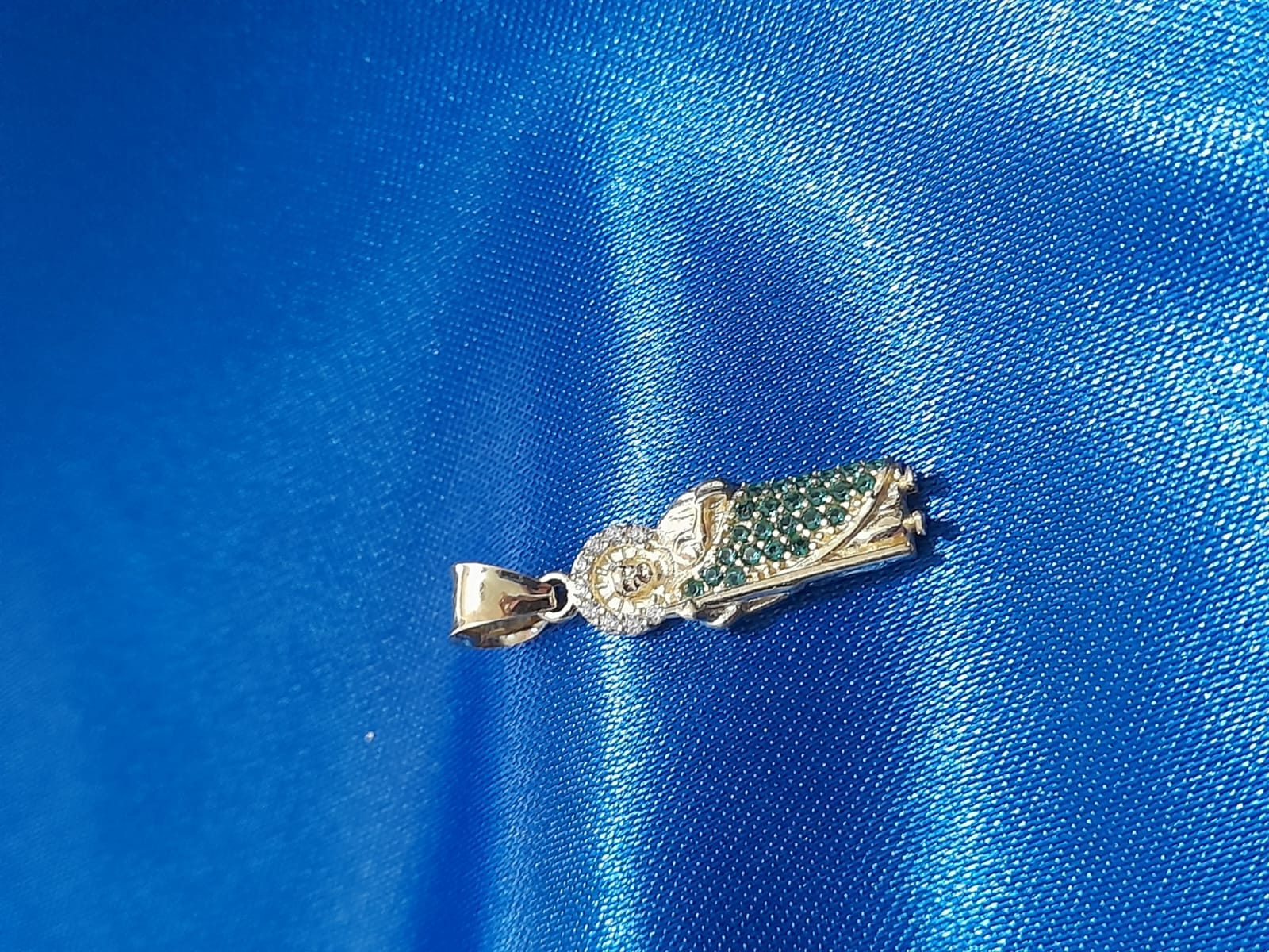 SAN JUDAS TADEA DE ORO DE 10K CON PIEDRAS INCRUSTADAS DE VERDE Y BLANCO